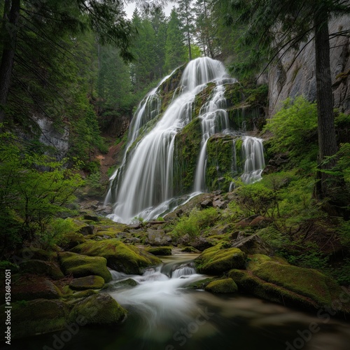 Obraz premium A serene waterfall cascades over moss-covered rocks in a lush, green forest surrounded by tall evergreen trees and rugged cliffs.