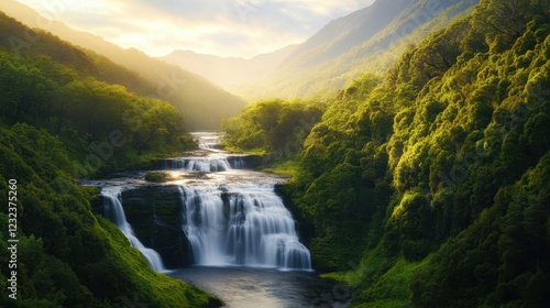 © nattapon98, Fototapeta premium A serene waterfall cascades through lush greenery, surrounded by misty mountains under a soft, glowing sky, creating a tranquil natural scene.
