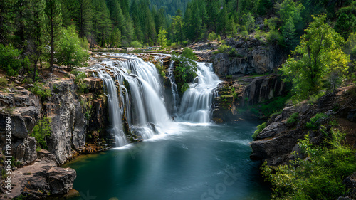 © mr Wajed, Fototapeta premium A serene waterfall cascading down a rocky slope surrounded by lush greenery and trees in a natural landscape
