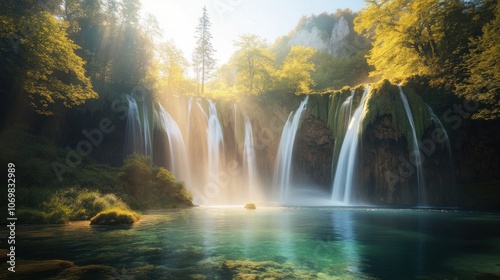 © SAQUEEN, Obraz premium A serene waterfall cascading into a tranquil pool, surrounded by vibrant foliage and sunlight.