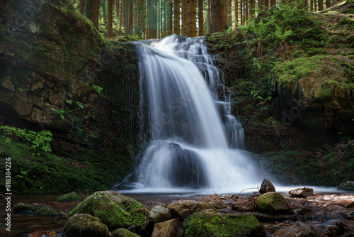 © AdobeTim82, Obraz premium A serene waterfall flows through lush vegetation in a forested ecoregion