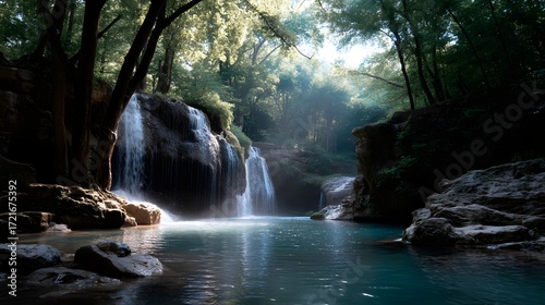 Fototapeta premium A serene waterfall framed by vibrant green foliage with soft sunlight...