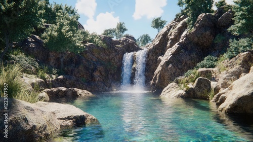 Fototapeta premium A serene waterfall in a hidden mountain valley, with water cascading over large rocks into a crystal-clear pool.