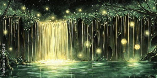 © Trionorejo, Naklejka premium A serene waterfall surrounded by glowing lights and lush greenery.
