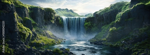 © BerkahStock, Fototapeta premium A serene waterfall surrounded by lush greenery and rocky cliffs under a bright sky.