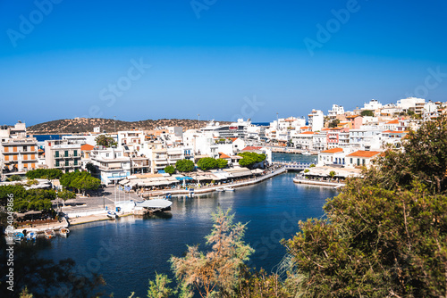 Obraz premium A serene waterfront town Agios Nikolaos in Crete, Greece, featuring...