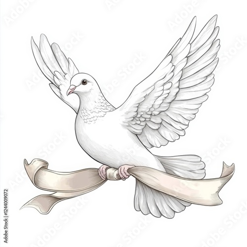 Obraz premium A serene white dove in flight, gracefully holding a ribbon, symbolizing peace...