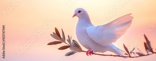 Obraz premium A serene white dove perched gracefully on an olive branch, symbolizing peace against a soft, colorful sunset backdrop.