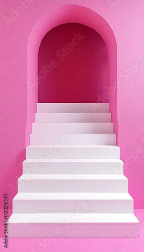 © Jamppidlaew, Obraz premium A Serene White Staircase Ascends in a Pink Archway of excellence in splendor beyond compare