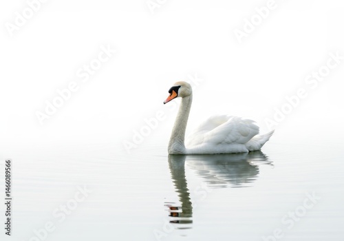 Fototapeta premium A serene white swan swimming gracefully in calm water with a clear reflection against a bright white background