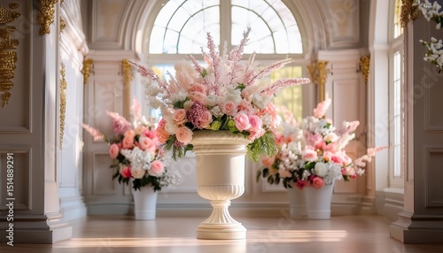 © Verdiana, Fototapeta premium a serene white urn surrounded by delicate flowers in a softly lit indoor space