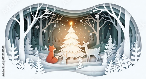 © SAFIICLON, Naklejka premium A serene winter forest diorama crafted in a digital paper art style, featuring a friendly fox and deer beside a luminous Christmas tree