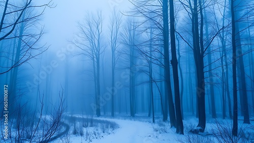 Naklejka premium A serene winter forest landscape with misty blue tones and a soft...