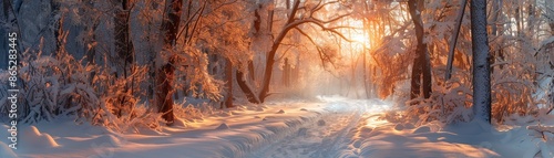 © Sunshine, Naklejka premium A serene winter forest scene with a snow-covered path and sunlight streaming through the trees at sunrise, creating a magical atmosphere.