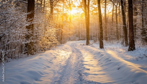 © Emma, Naklejka premium a serene winter forest scene with a snow covered path illuminated by the golden light of sunrise creating a magical atmosphere