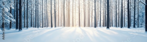 Naklejka premium A serene winter forest scene, with snow-covered trees and soft light filtering through the branches, creating a tranquil atmosphere.
