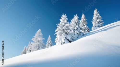 © Pinklife, Fototapeta premium A serene winter landscape featuring a cluster of snow-covered evergreen trees arrayed on a gently sloping, sunlit hillside under a clear blue sky.