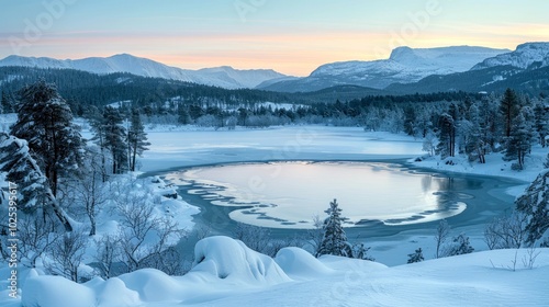Fototapeta premium A serene winter landscape featuring a frozen lake surrounded by snow-covered...