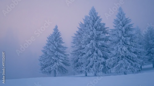 Naklejka premium A serene winter landscape featuring snow-covered evergreen trees in a foggy...