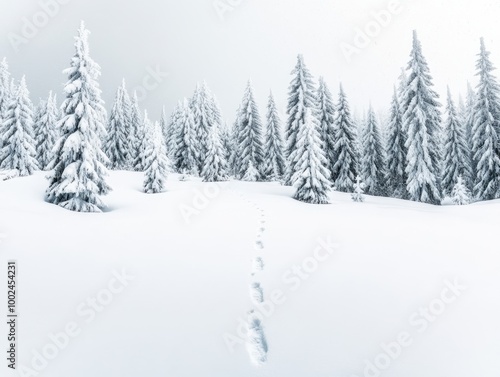 Fototapeta premium A serene winter landscape featuring snow-covered trees and a single set of...