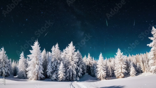 Naklejka premium A serene winter landscape featuring snow-covered trees under a starry night sky with shooting stars. Perfect for winter and nature-themed projects