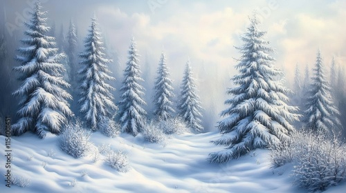 Naklejka premium A serene winter landscape showcasing snow-covered evergreen trees blanketed in fresh snow, creating a peaceful and tranquil atmosphere in a winter wonderland.