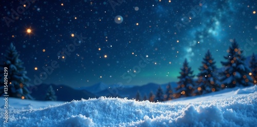 © Pawarit, Naklejka premium A serene winter landscape under a starry night sky with snow-covered terrain.