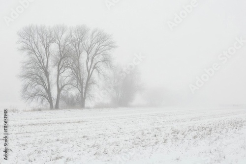 Obraz premium A serene winter landscape with bare trees in a foggy, snowy setting.