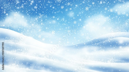 © fotofabrika, Naklejka premium A serene winter landscape with falling snowflakes and rolling hills under a clear blue sky during a bright day