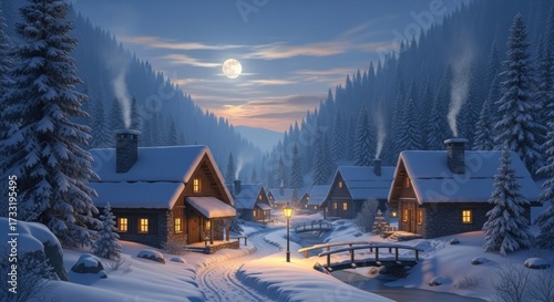 © Veayo, Fototapeta premium A serene winter landscape with snow-covered houses, a bridge, and a moonlit sky.