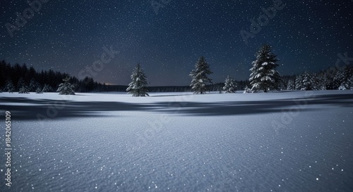 © soem, Fototapeta premium A serene winter landscape with snow-covered trees and a starry night sky.