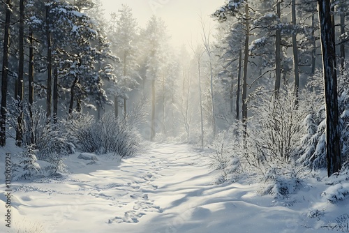 Obraz premium A serene winter landscape with snow-covered trees and a winding path...