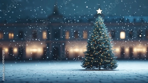 Naklejka premium A serene winter night scene featuring a beautifully lit Christmas tree...