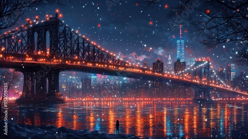 © aritha, Obraz premium A serene winter night scene featuring a bridge and city skyline illuminated by lights.
