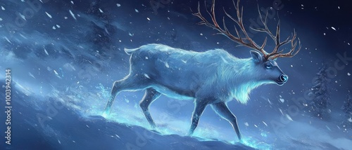 Obraz premium A serene winter scene featuring a majestic reindeer walking through snow...
