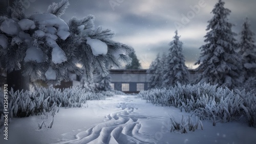 Naklejka premium A serene winter scene featuring a snowy pathway leading to a cozy, rustic cabin, surrounded by tall evergreen trees and a gentle snowfall.