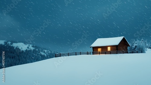 © Thi, Fototapeta premium A serene winter scene featuring fluffy snow gently falling over a cozy mountain cabin.