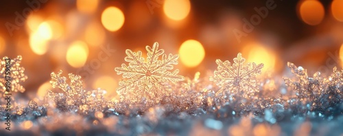 © Thamonchanok, Naklejka premium A serene winter scene featuring shimmering snowflakes against a warm bokeh background, evoking cozy holiday feelings.