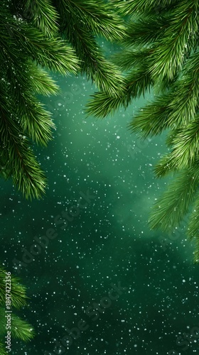 Obraz premium A serene winter scene featuring snow falling against a rich green backdrop, framed by lush evergreen branches.