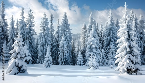 Naklejka premium A serene winter scene of snow-covered pine trees, capturing the quiet beauty of a snowy landscape under a crisp blue sky.