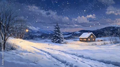 Naklejka premium A serene winter scene with snow-covered landscape, a cozy house, a Christmas...