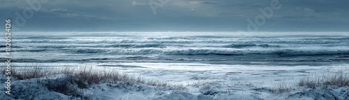 Fototapeta premium A serene winter seascape featuring icy waves and a tranquil shoreline under a...