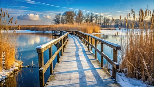© PloyJai, Naklejka premium A Serene Winter Walkway Across a Frosty Lake, Surrounded by Golden Reeds and Snow-Covered Banks under a Clear Blue Sky
