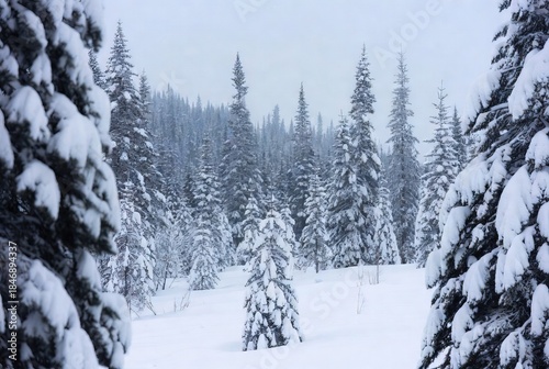 © Nasrin, Naklejka premium A serene winter wonderland with snow-covered fir trees in a peaceful forest landscape