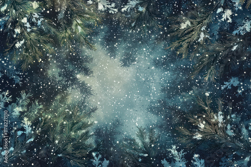 © Dusit, Obraz premium A serene winter woodland scene with snowflakes gently falling through pine trees