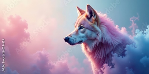 © DeeDay, Naklejka premium A Serene Wolf Amidst Pastel Clouds, a Dreamlike Portrait of Canine Majesty