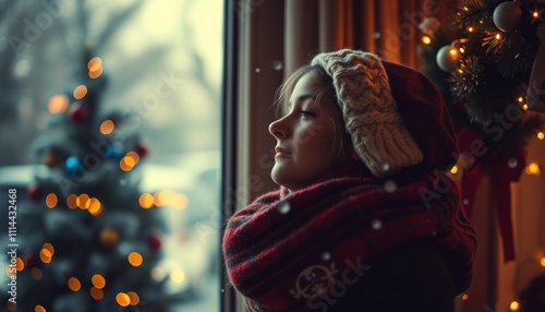 Obraz premium A serene woman gazes out the window, surrounded by festive decorations and a...