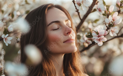 © Dmitriy, Fototapeta premium A serene woman in her late thirties with long brown hair enjoys the scent of blooming almond trees, surrounded by white and pink blossoms in a tranquil orchard.
