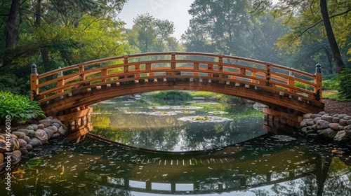 Fototapeta premium A serene wooden bridge arches gracefully over a tranquil pond surrounded by...