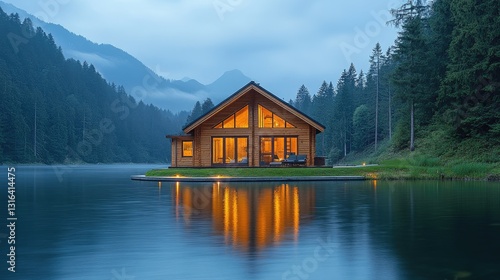 © Julia, Fototapeta premium A serene wooden cabin reflecting in calm waters at twilight, nestled among trees in a mountainous landscape